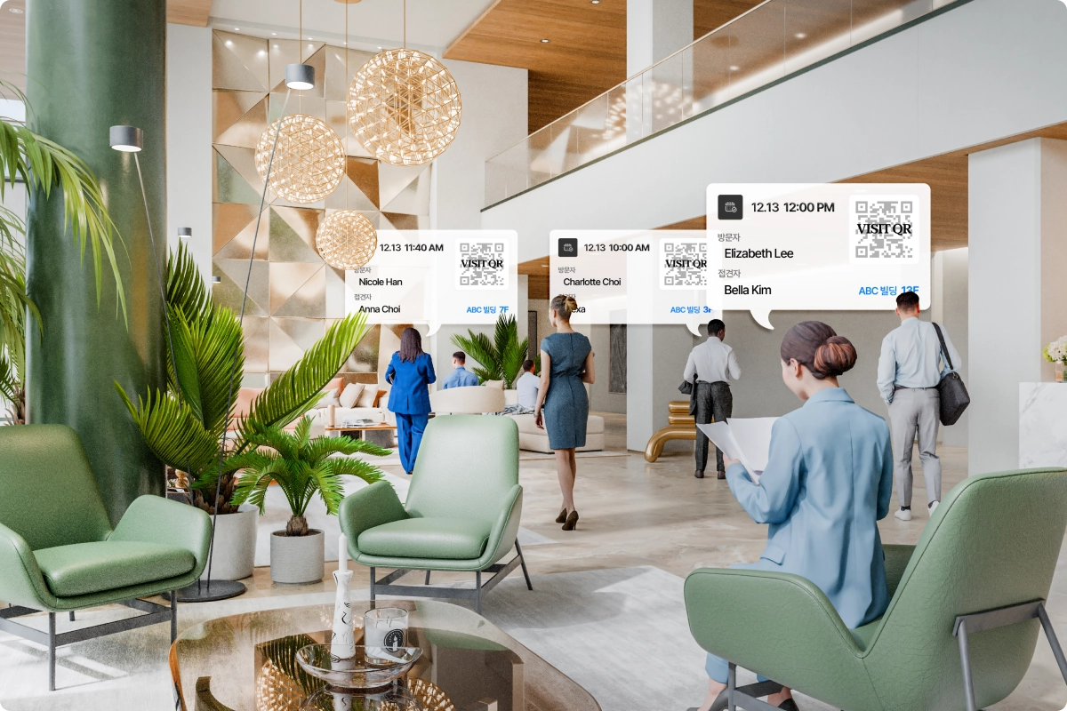 - QR코드 기반의 비대면 셀프 체크인으로 방문객 보안 강화- 차량 정보 입력을 통한 주차 인증 연동- 노트북, 태블릿 등 디바이스 장치에 대한 반입 관리